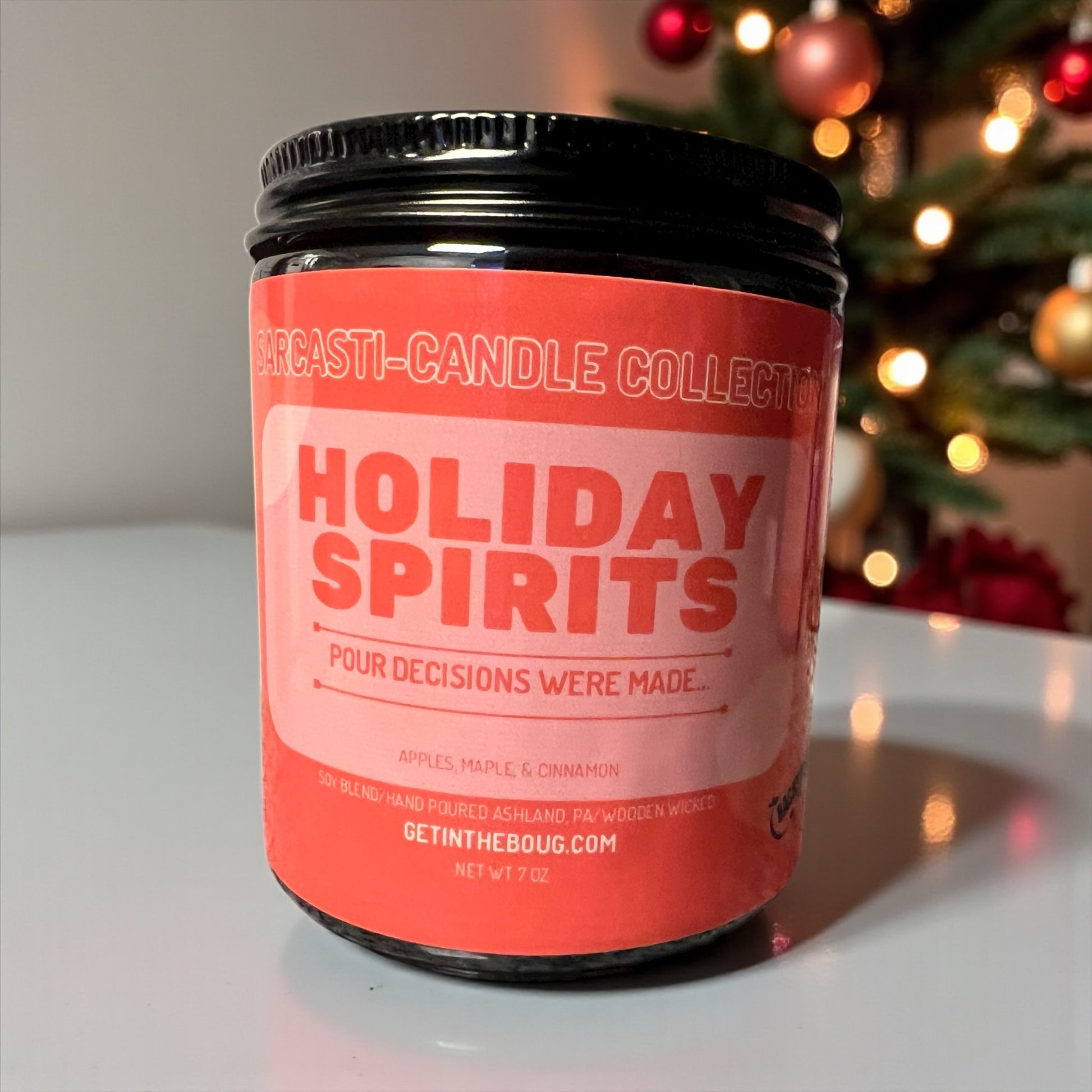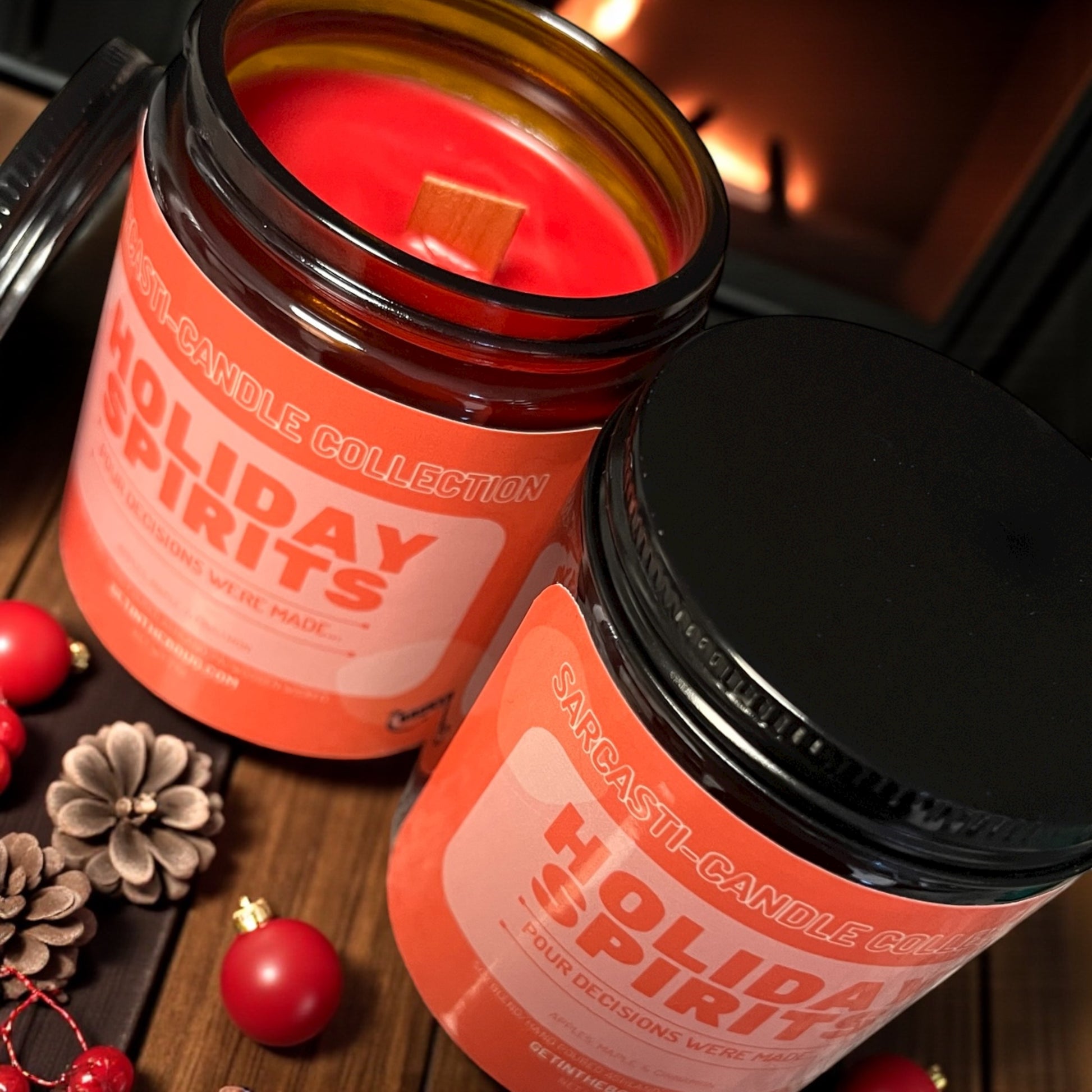 Skip the mall talk and light up Holiday Spirits, where apple, maple crumble, and cinnamon swirl together like your best (and worst) holiday decisions. This candle smells like festive chaos, sweet comfort, and a dash of “oops.” Warm, spicy, and just indulgent enough to make you forget that you promised to host dinner again. Best enjoyed with a drink in hand, a half-decorated tree, and your dignity hanging by a cinnamon stick. Light it up. Laugh it off. And remember calories and consequences don’t count in December.