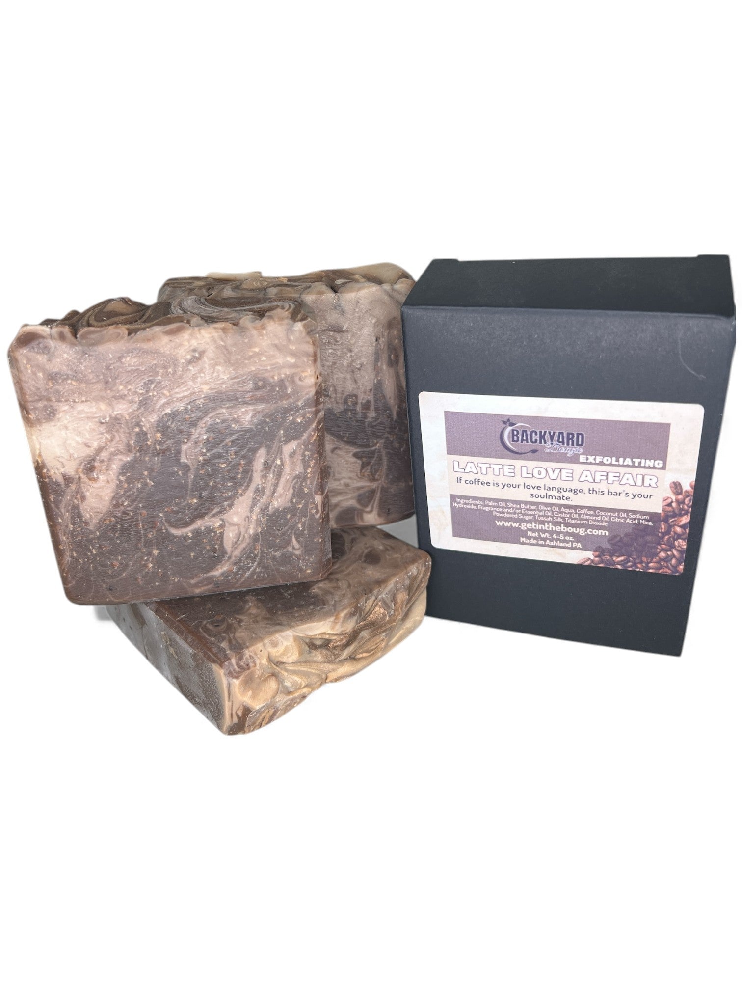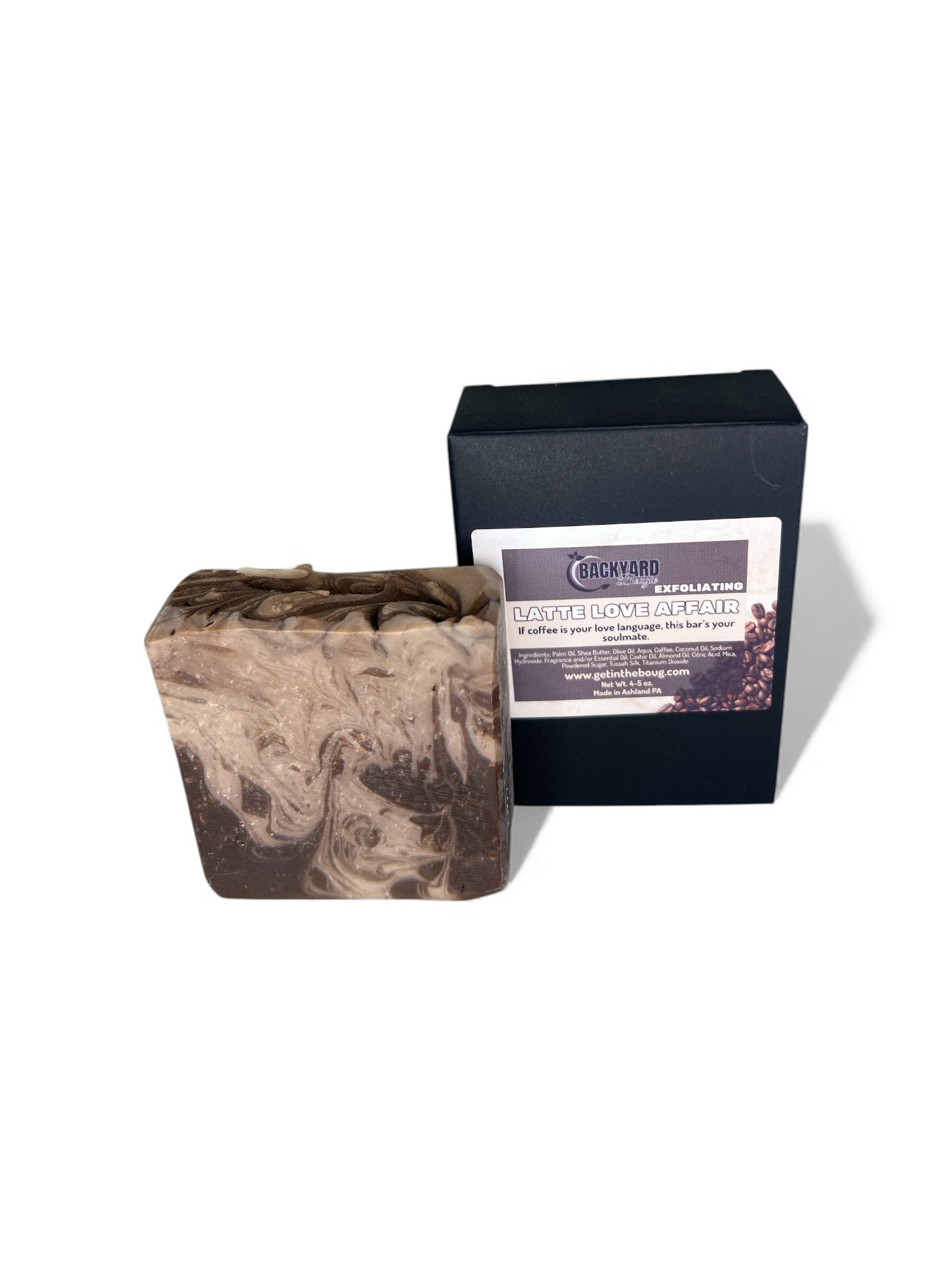 Ingredients: Palm Oil, Shea Butter, Olive Oil, Aqua, Coffee, Coconut Oil, Sodium Hydroxide, Fragrance and/or Essential Oil, Castor Oil, Almond Oil, Citric Acid, Mica, Powdered Sugar, Tussah Silk, Titanium Dioxide